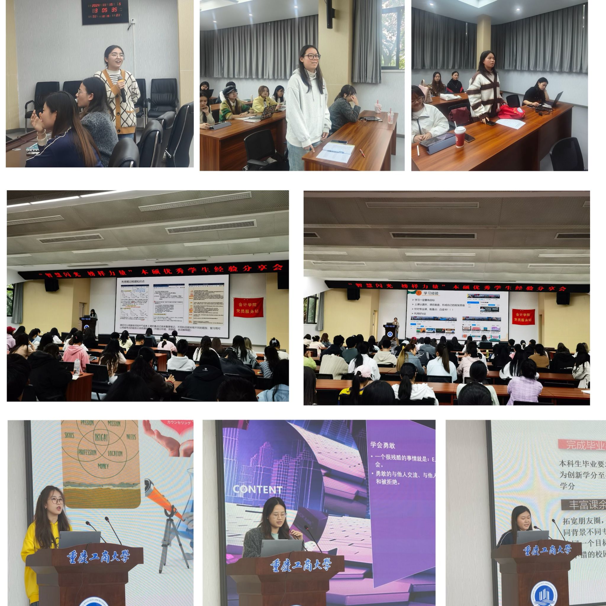 本次活动采取讲座与互动相结合的形式进行,五位优秀员工代表依次通过PPT展示、个人演讲的方式,分享他们在学习、科研、社会实践等方面的成功经验和心得体会。来自24级审计硕士班的王霖同学,分享了如何在繁重的学习任务中保持动力与热情,以及高效学习策略与方法。23级会计硕士班的李思源同学,分享了自己的考研备考经验和读研究生期间的心得体会。21级CIMA班的贺艺文同学,分享了自己的学习、科研经验和成长感悟,建议大家保持一个稳定持续的学习心态,并适当使用学习工具提高效率。22级智能会计班的贾罗茜同学,分享科研竞赛的宝贵经验,鼓励大家多多参与科研竞赛并讲述在社会实践中如何将所学知识应用于解决实际问题,为社会贡献自己的力量。21级智能会计班的张婧同学,为大家分享她的实习故事,以及学科竞赛中的备赛历程与获奖心得,建议同学们在学习和竞赛的路上要学会积极主动,注重自我锻炼。在互动答疑中,针对同学们有关考研、考证资料搜集等问题,分享者们耐心解惑,为同学们提出了许多宝贵的意见和建议。